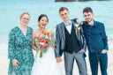 和装から洋装に、髪型もチェンジしていざ!BEACH撮影STARTです。とは言え、空がキレイすぎて一旦青空とお2人と♡
