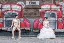 オシャレな建物で撮影しています~!ご新婦様のドレスはショルダータイプのスレンダードレスです♪可愛いです~♡
