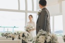 新郎さま着用のタキシードは、ライトグレーの光沢のあるデザインです♪明るめのお色なので写真映えする一着です☆ボタニカル柄もの蝶ネクタイを合わて沖縄感満載です♪