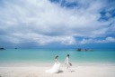 手を繋いで、お二人からカメラに目線を頂きました~!青い海と白い砂浜、青い空を撮ってみました~♪