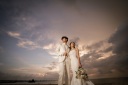 向かい合って、アンドのオブジェを投げるショットです♡背景のビーチが鮮やかで、お2人の幸せな空気の伝わるショットで素敵♡