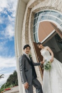お二人には、カメラに目線を頂きました!アクアルーチェチャペルの中はホワイト色で、ガラス張りから海が一望できます~♪