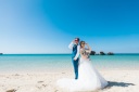 撮影スタート♪海にピッタリなカラードレスを着用してくださいました☆新郎様のタキシードもベストとネクタイの柄を揃えてかっこよく決まってますね!