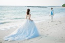 ビーチ撮影では、デートっぽい感覚を忘れないようにお2人だけの空間を大切にしながらお写真を撮影していきます。歩きやすいようにドレスを持ち上げながら手を繋いでます。