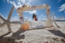 手を繋いで、カメラにお目線を頂いております♡波の動きがとても綺麗に写っております~!!ドレスのトレーンが長くて綺麗に靡いております~綺麗ですね~♡