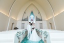 アクアルーチェチャペルをバックに外観での撮影!青空に映える白いロマンチックなチャペル!