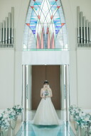 バージンロードの先で祭壇に立つお2人…。手元を見つめてロマンチックな一枚!
