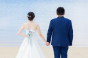 手を繋いでビーチを眺めるお二人の後ろ姿をパシャリしました♪新婦さまが気に入ってくれたドレスのサッシュベルトの色味が奇麗で良い感じでした♡