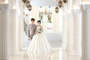 3着目カラードレスでは雪のお部屋のセットで撮影されました!床の反射を活かした映し込みのお写真!フラワーシャワーもして華やかなお写真に!