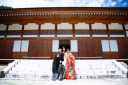 色打掛は自然いっぱいのこちらのお寺にはピッタリ。赤色が緑の中で映えますね。