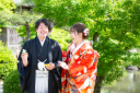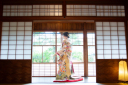 資料館にはこんな庭園もございます。緑に囲まれての撮影は和装が映えます。