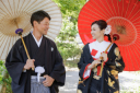 赤い色打掛がとってもお似合い。おふたりの凛とした立ち姿がまるで映画のワンシーンみたいですね。