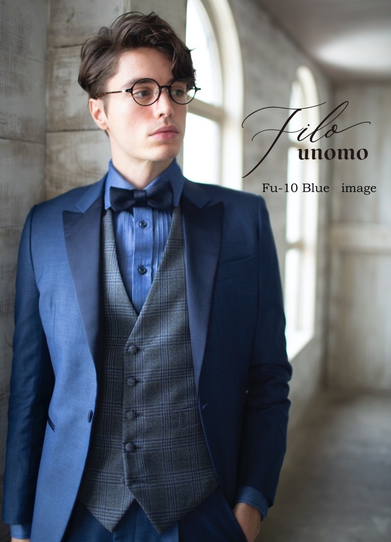深みのあるブルーが洗練された印象を与えるタキシードです。光沢のあるショールカラーと、グレーのベストを合わせた3ピーススタイルがクラシカルかつモダンな雰囲気を演出。特別な日にふさわしい、個性的な一着です。