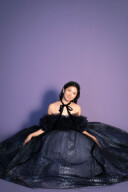シックな衣装に映える花びらの赤。写真の中でアクセントになり、自然さとおしゃれさのバランス
