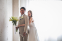 和装の撮影では「シンプルな空間での撮影はマストで!」と白い壁の前で。おふたりの和やかなご表情がより引き立って、おふたりの仲睦まじい空気感もしっかりと!