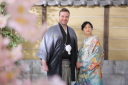 正座やお辞儀ショットでは背景を金屏風、ハートの猪の目窓、掛け軸の3つの中からお選びいただけます。掛け軸だとかっちりとした雰囲気で撮影ができます!