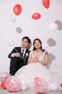 ハートの風船をカメラに向けて投げていただきました!躍動感のある写真に!