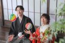 掛け軸のあるお茶室で、着物を下ろしてきっちりショット♪新宿店のスタジオには、金屏風の背景もございます!