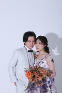 ご新婦様のソロショットです。スタッフさんが貸してくれたマスコットキャラのぬいぐるみと一緒に。