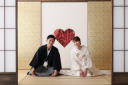二人がそれぞれ紅白の和傘を持っての撮影。スタジオだけどロケーション感を演出。