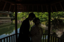 撮影はまず、お堀沿いからスタートしました。この日は雲行きが少し不安定でしたが、思いがけず綺麗な夕日が顔を出し、新郎新婦のおふたりを優しく包み込んでくれました。