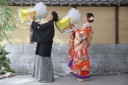 こちらのシーンは、秋の訪れを感じるような黄色やオレンジと和装の衣装をお召しになったお二人の雰囲気と、池の反射が素敵な一枚です。