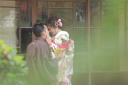 木壁背景での手繋ぎショット。ご新婦様のお着物に使用した小物の色味が全体の雰囲気と統一されていて素敵です゚.+°