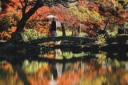 お二人の素敵な笑顔。背景には、竹林の隙間に覗く紅葉が輝く。