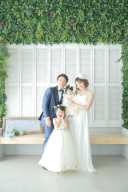 手作りの花かんむりをつけてお姫様気分かな?パパとママに挟まれて幸せいっぱいのショット!