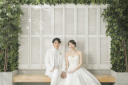 お花の背景でのラブラブショット!おふたりの笑顔が素敵です!