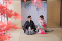 手をつないでの後ろ姿。お嫁様のお着物が緑に映えます♩