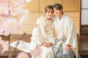 椅子に座ったご新婦様を後ろからそっと抱きしめるご新郎様。見つめ合うお二人、とても幸せそうな表情です。