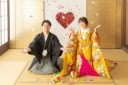 場所を変えて縁側ショット。新郎様が新婦様のほっぺをツン♪