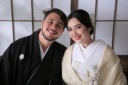 こちらは前撮りにて、とてもご希望のお辞儀ショットとなっております!後ろには掛け軸もあり落ち着いた中でもお二人のナチュラルな雰囲気でお撮りできます