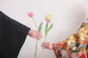 お着物のコーディネイトカラーとチューリップの色合いがピッタリです!