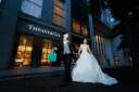 渋谷店のハウススタジオに移動!ウェディングドレスとカラードレスの2着撮影です。黄色いお花の背景がお二人を彩ります。