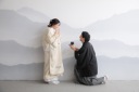 背中合わせで撮影した、スタイリッシュな一枚。和装の美しさとお二人の凛とした表情が際立ちます。