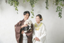 この時期は和装ロケーション撮影がとっても人気!庭園には緑の反対色の赤色着物がよく映えます。