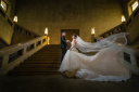 博物館の開館前、早朝での撮影はステンドグラスから差し込む朝日がとても綺麗でお二人を優しい光で包んでくれます