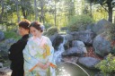 和室のある日本庭園とキラキラとした光に包まれたお二人。