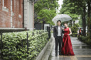 シンプルな背景は和傘も映えます。より和装らしさが増しますね。