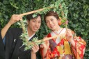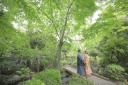 爽やかな新緑の背景に華やかなお着物と真っ赤な和傘がとっても映えます。