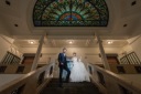 2階部分から踊り場にいるお二人を撮影したカット。ご新婦様のドレスのシルエットが美しく映えます。