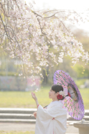 ご新婦様の思い入れのあるお着物。緑が濃くなってきた庭園と美しく調和していました。