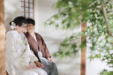 本堂に上がって撮影致しました。霞がかった空と寄り添うお二人の雰囲気が相まって撮影に関わったスタッフが優しい気持ちに包まれました。