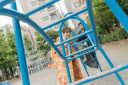 真っ白背景で床に座って撮影。シンプルでおしゃれな雰囲気。