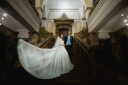 あえて目線を外したクールな一枚。シックなライティングで、お二人の横顔と衣装の質感を際立たせた、ポスターのような仕上がりです。