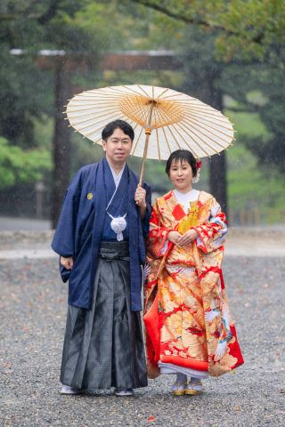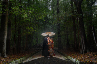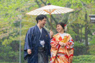 雨と強風の中の撮影でした。 風で横雨が顔にかかった時もあり、正直撮影中は大変な部分もありました。 ですが、写真の仕上がりを見ると撮影での大変さは一つも写っておらず、むしろ雨の時にしか取れない風情のある写真となっており、感動しました。 スタッフさんもズブ濡れになりながらも、一生懸命頑張っていただいたおかげもあって、 スタッフ皆さんの「良い瞬間を残したい!!」という想いが詰まった写真となったと思います。