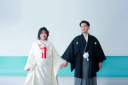 やわらかな色みの、フラワーベースと白無垢の相性が◎