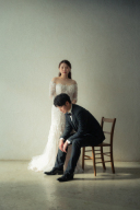 ドレスとスーツが似合う洋風のスタジオ背景へ移動!カーテン越しに外から差し込む光を再現。